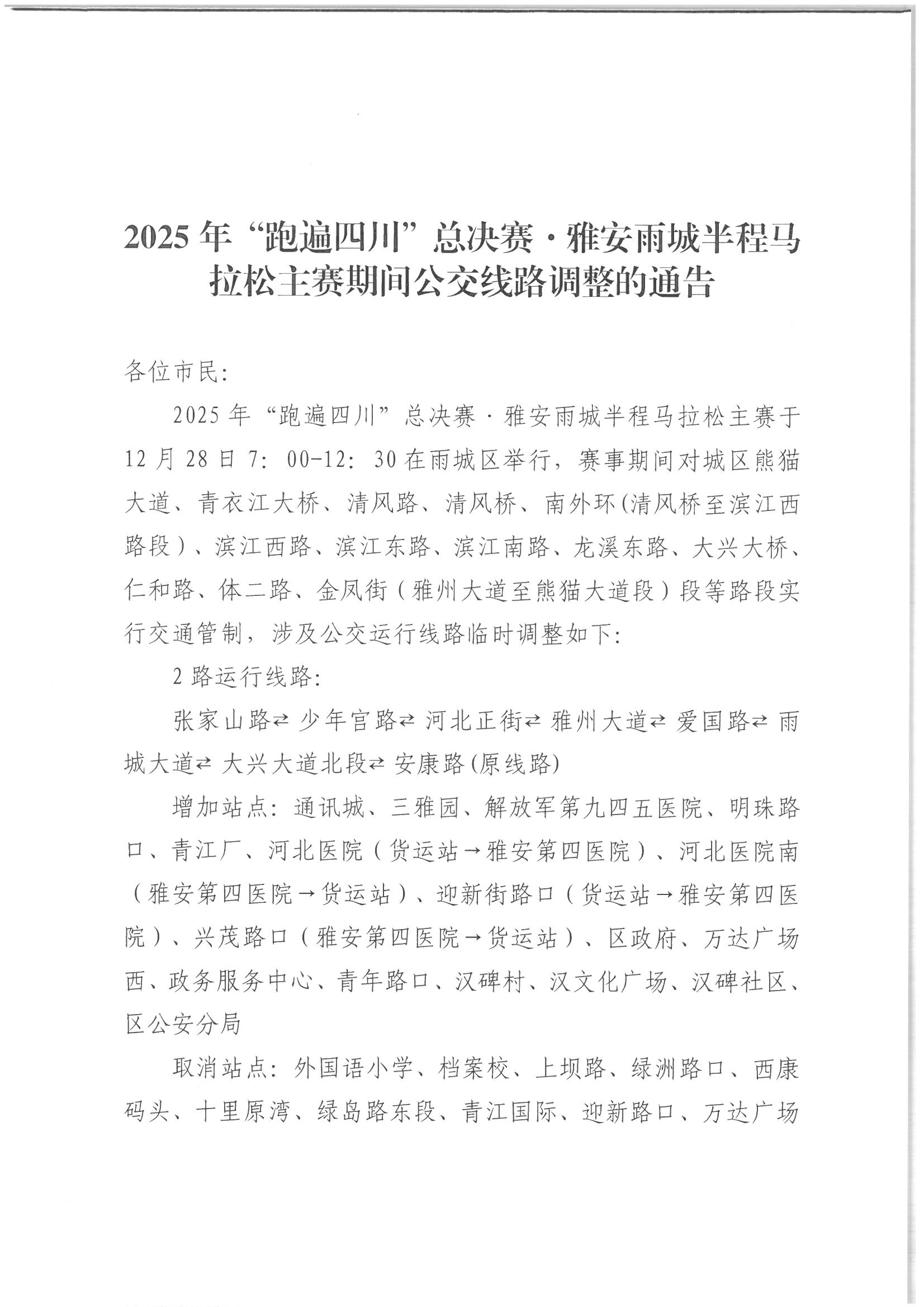 2025年“跑遍四川”总决赛·雅安雨城半程马拉松主赛期间公交线路调整的通告