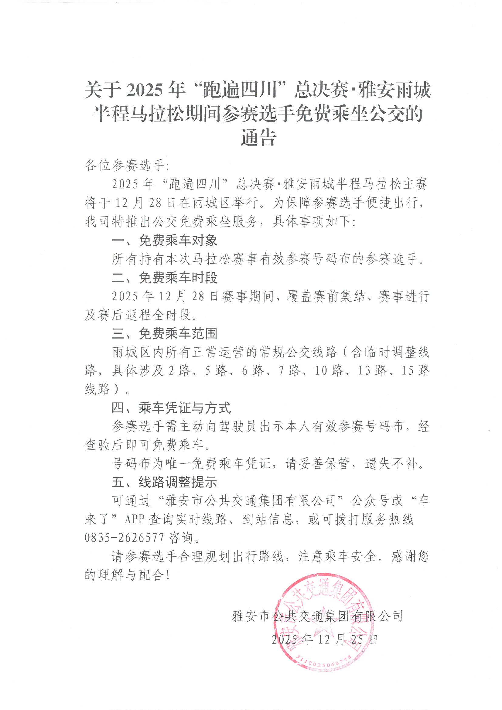 关于2025年“跑遍四川”总决赛・雅安雨城半程马拉松期间参赛选手免费乘坐公交的通告